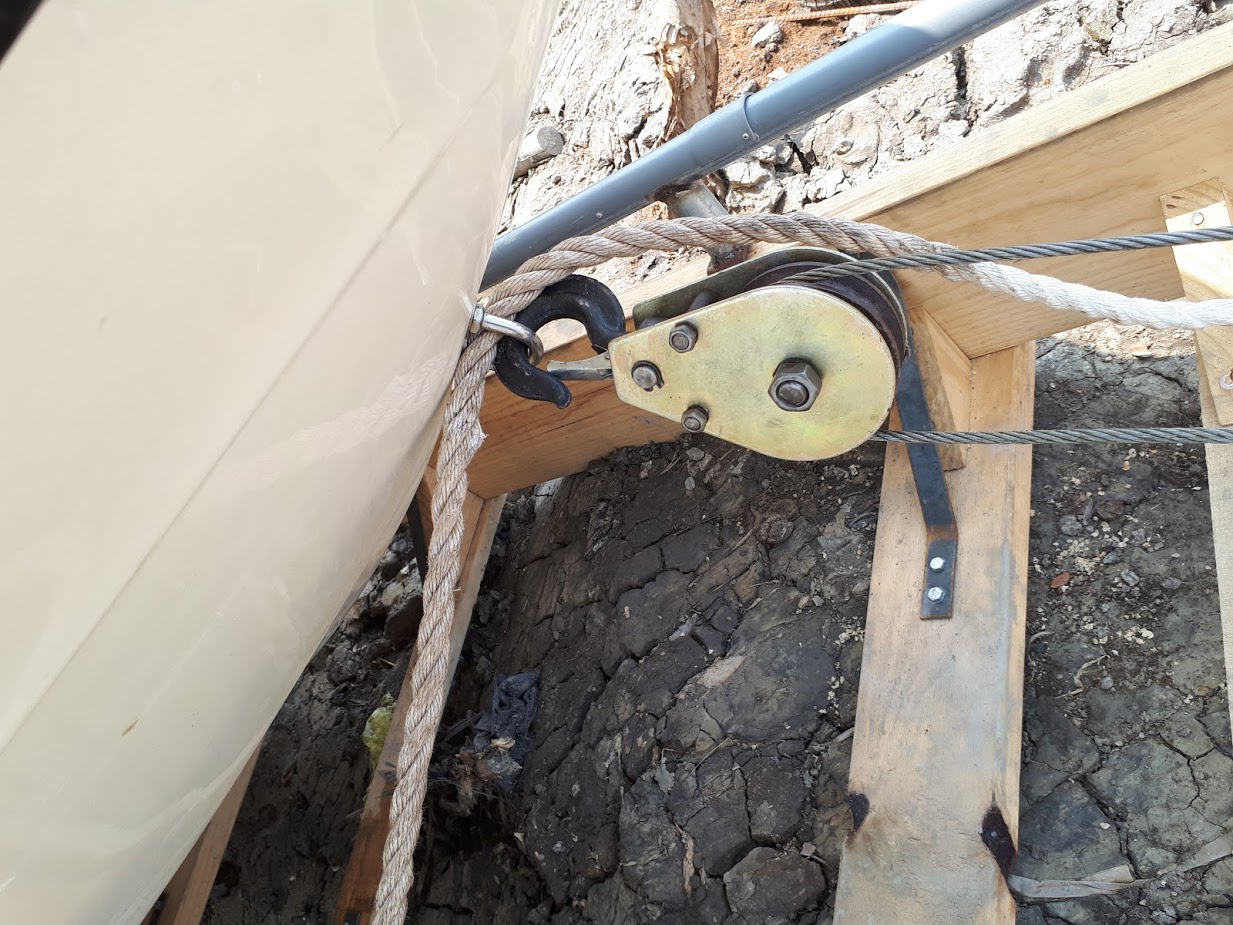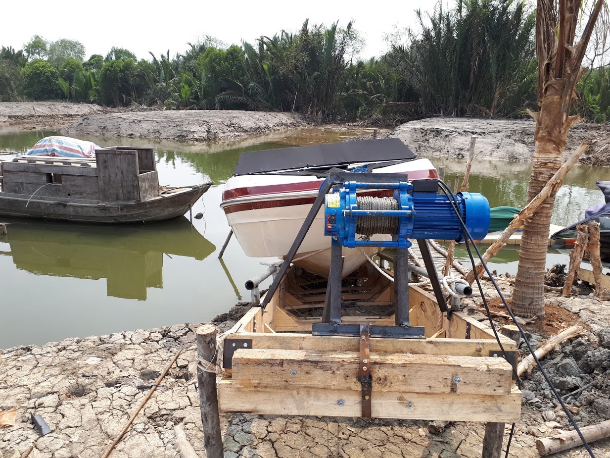 Thông thường, khi cano, tàu thuyền không sử dụng trong thời gian dài sẽ được kéo lên khỏi mặt nước để hạn chế các tác động ôxi hóa, ghỉ sét, bám rong rêu,... làm ảnh hưởng đến chất lượng của cano, tàu thuyền. Trong thi công công trình kéo cano này, bờ sông không bằng phẳng, do đó, M5s dùng tời điện 1000kg đa năng kéo theo phương nghiêng, tác động lực để kéo cano trượt trên giàn đỡ.