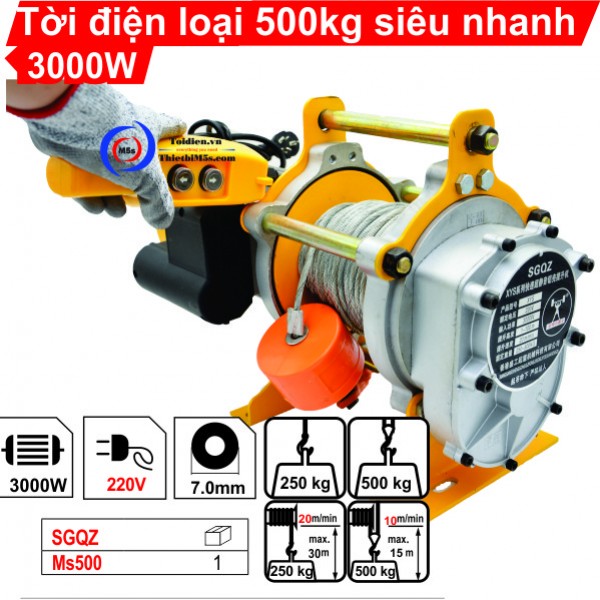 Máy tời kéo mặt đất 500kg SGQZ là thiết bị đến từ Trung Quốc, có tải trọng nâng hạ hàng hóa là 250kg/1 móc - 500kg/2 móc với công suất lên tới 3000W.