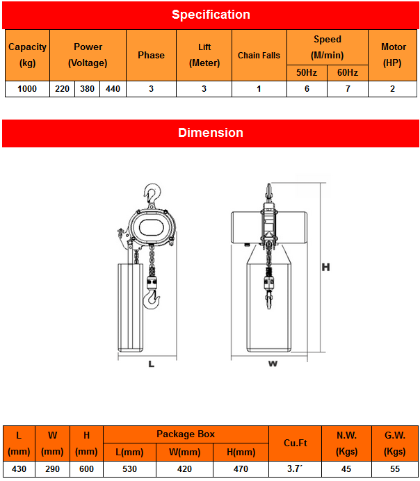 Pa lăng xích điện 1 Tấn DU-905 có những đặc tính vượt trội như sau: