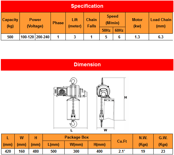 - Pa lăng xích điện 500kg với thiết kế gọn nhẹ, được chế tạo từ hợp kim nhôm