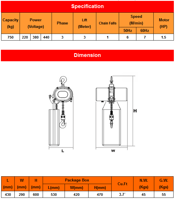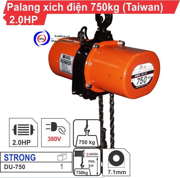 - Pa lăng xích điện 750kg DU-750 sử dụng nguồn điện 3 pha.