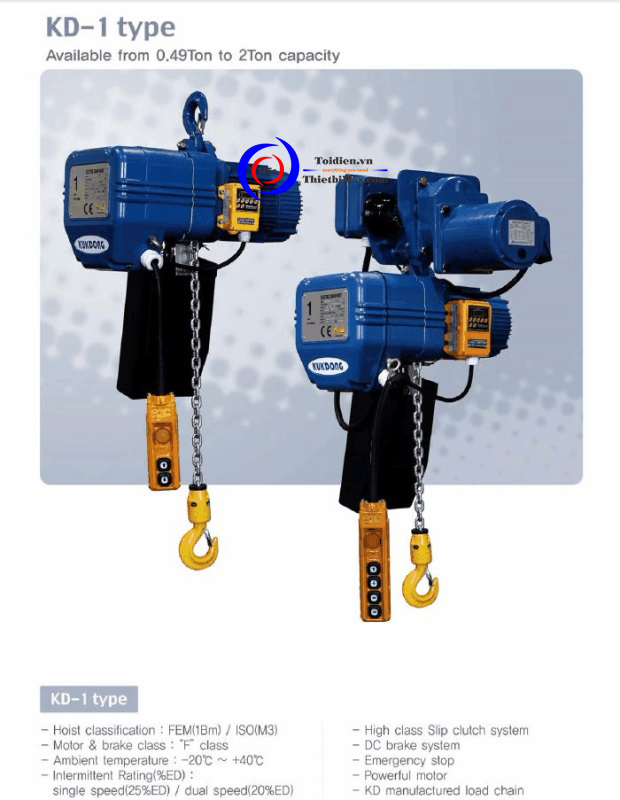 Palăng xích điện 0.5 Tấn KD-1 được sử dụng chủ yếu trong các vực từ nhà xưởng, xí nghiệp, kho hàng, bến cảng, công trình xây dựng,… Palăng xích dùng điện năng KD-1 được cấu tạo từ vật liệu cao cấp, đảm bảo an toàn tuyệt đối cho người sử dụng và đạt hiệu suất cao.