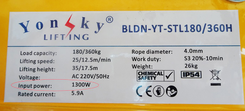 Tải trọng của thiết bị có khả năng kéo, nâng hạ hàng có có trọng lượng lên đến 1000kg. Với chiều cao nâng hạ là 20m/cáp đơn và 10m/cáp đôi. Tốc độ nâng hạ cực kỳ nhanh với 10m/phút với trọng lượng 500kg và 5m/phút với trọng lượng 1000kg