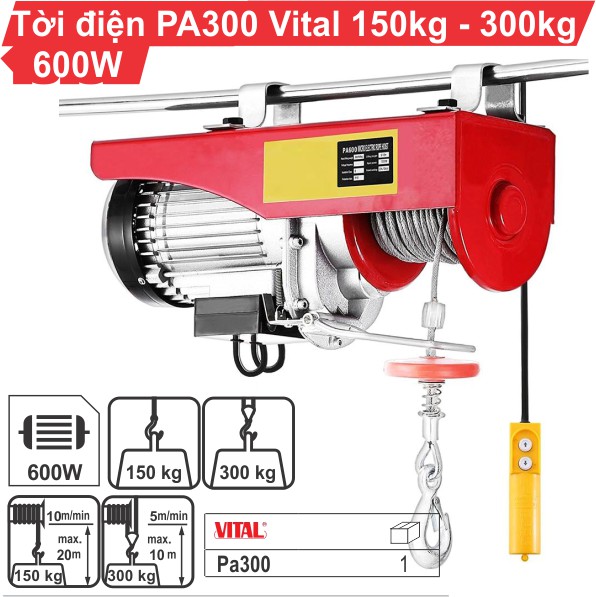 Tời hàng Vital sử dụng nguồn điện gia đình 220V, hoạt động với công suất lên đến 600W, cho khả năng nâng hạ mạnh mẽ và nhanh chóng. Tời nâng hàng 300kg được trang bị dây cáp chắc chắn, kéo được tải trọng lớn nhất là 300kg với dây cáp đôi lên chiều cao 12m, tải được kiện hàng nặng 150kg với dây cáp đơn lên chiều cao 25m.
