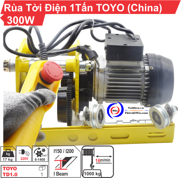 Rùa tời điện 1 tấn TOYO sử dụng nguồn điện 220V sẵn có, hoạt động với công suất 300W mạnh mẽ, giúp hỗ trợ nâng hạ và di chuyển hàng hóa có tải trọng lên đến 1000kg một cách đơn giản, hiệu quả và an toàn.