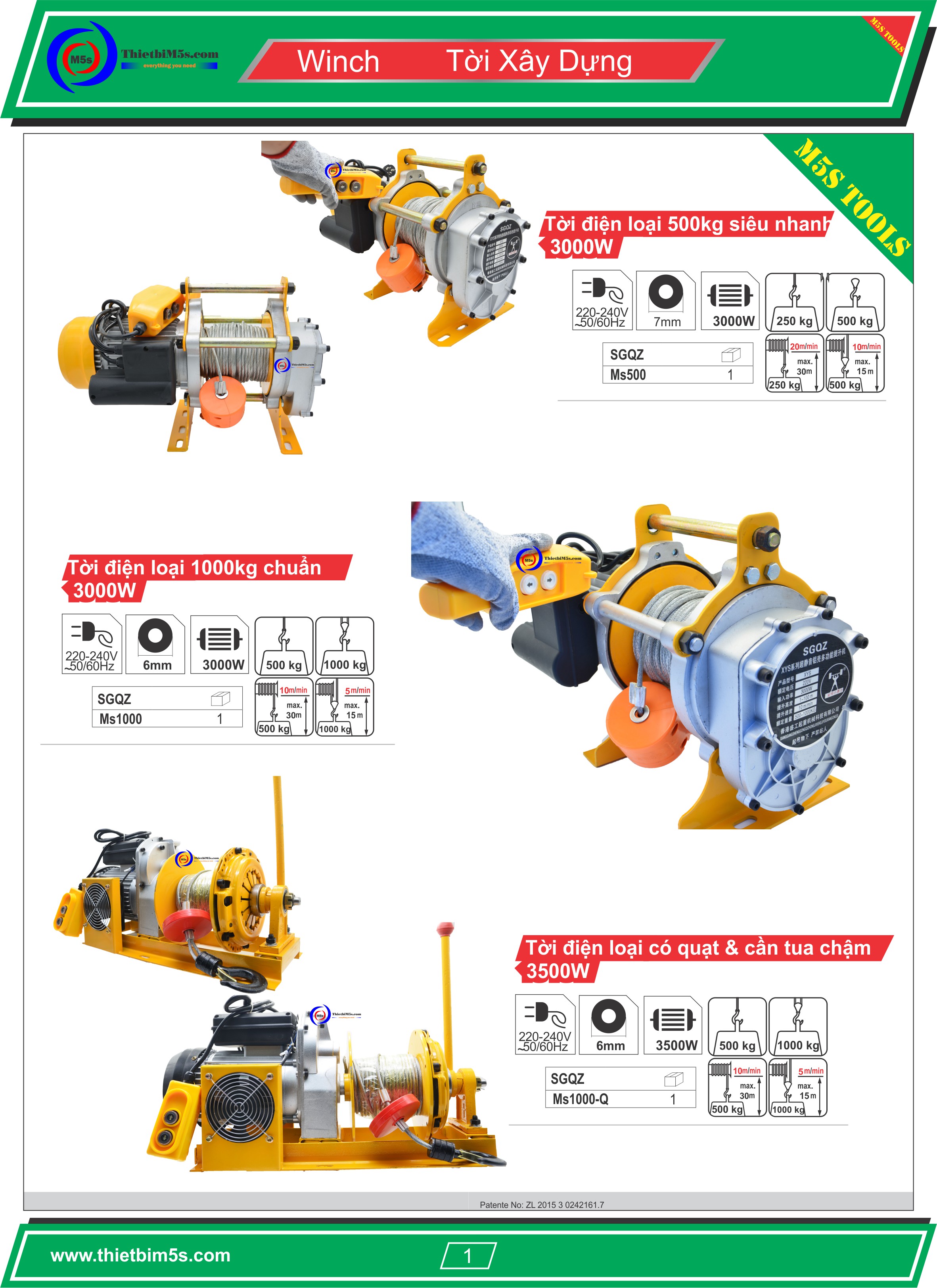 Tời Điện 1000kg đa năng SGQZ có thể nâng vật từ 500-1000kg, chiều dài cáp cuốn là 30m, được trang bị 2 móc nâng và tùy theo mục đích sử dụng mà bạn có thể sử dụng 1 hoặc 2 móc nâng. Nếu bạn muốn nâng vật có khối lượng hơn 500kg, bạn cần sử dụng 2 móc kéo.