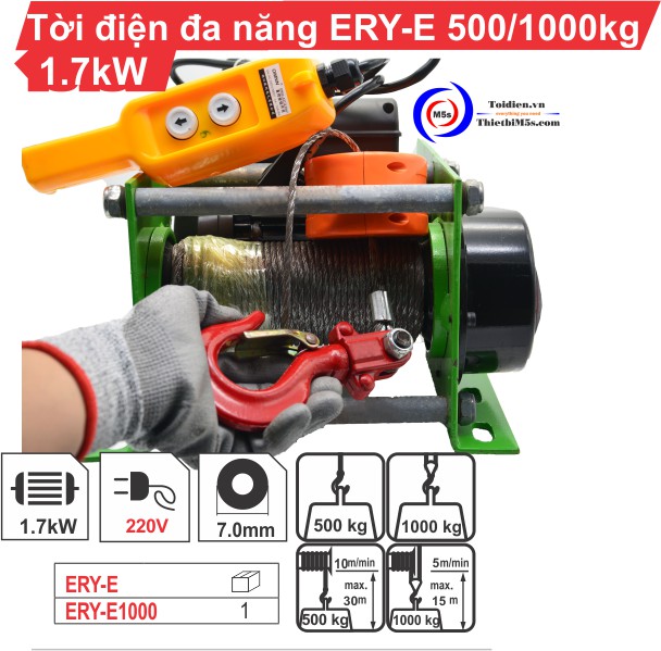 Tời Điện 1000kg Đa Năng ERY-E 1700W hoạt động với công suất 1700W, có thể nâng vật từ 500-1000kg, chiều dài cáp cuốn là 30m và có thể lắp thêm dây tùy theo mục đích sử dụng. Nếu bạn muốn nâng vật có khối lượng hơn 500kg, bạn cần sử dụng 2 móc kéo. Khi sử dụng 2 móc kéo, cần phải đi bằng dây cáp đôi, do đó chiều dài cáp giảm đi một nửa.