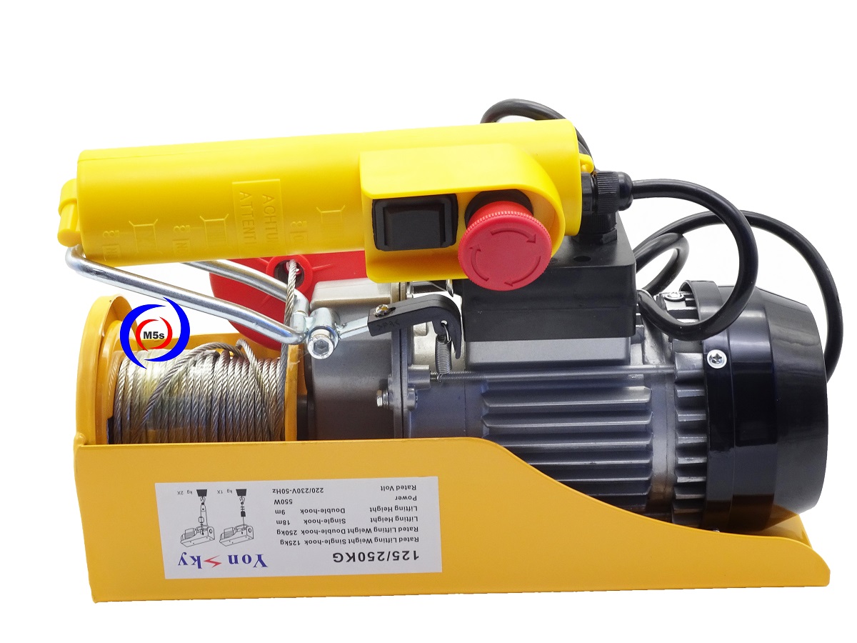 Tời điện 250kg YonSky có công suất 550W, với khả năng nâng hạ tải trọng tối đa đến 200kg. Máy có khả năng tải trọng lượng 200kg với 2 móc lên chiều cao 9m, và tải trọng lượng 100kg với 1 móc lên chiều cao 18m.